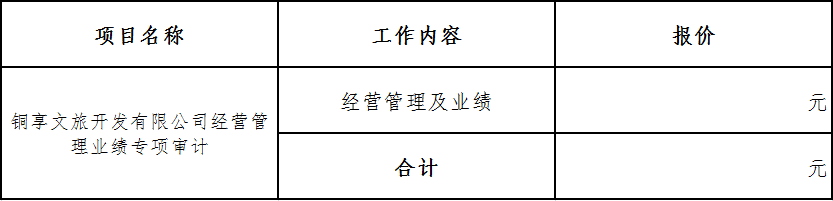 針對貴公司對銅享文旅開發(fā)有限公司經(jīng)營管理業(yè)績專項審計,我所報價如下: